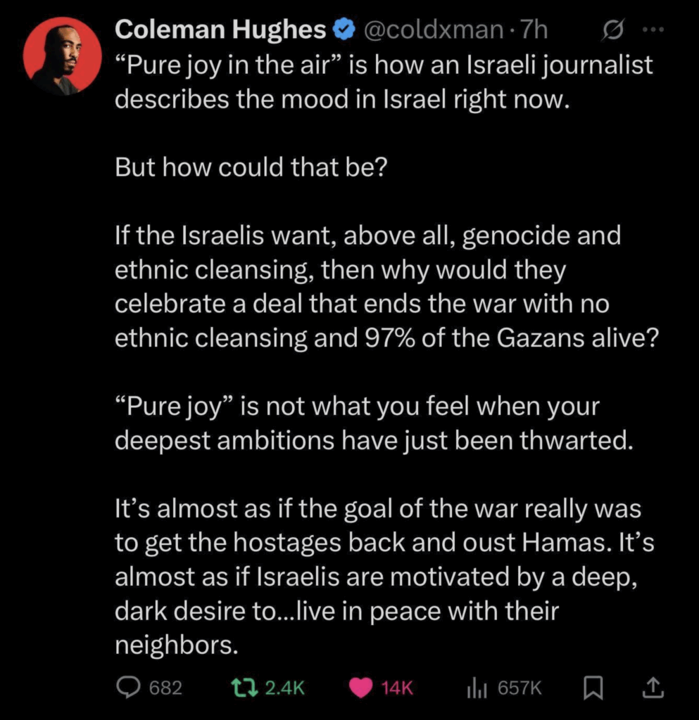 Further, the left, which has so energized itself by its antisemitic hatred of Israel and it’s “settler colonialism,” decrying the “genocide” of Gazans, must now reexamine that premise. Coleman Hughes offers a nice rejoinder on X: