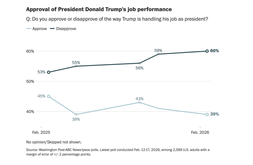 Friday, was not kind to Mr. Trump, but Adam Smith will have his day. And so will our Founding Fathers. As we predicted, Mr. Trump’s tariff’s did not pass legal muster at the Supreme Court, just as they did not in the lower court processes. His preferred path was to use the International Emergency Economic Powers Act (IEEPA). Mr. Trump does have long-standing, widely recognized powers to implement tariffs through other sections of the U.S. code (e.g., Trade Act of 1974). Yet those are much more limited in terms of time they are allowed, the ability to legally justify, and/or require some level of congressional oversight. Hence Mr. Trump’s great desire to use the IEEPA. Nevertheless, as also expected, Mr. Trump is doubling down as he quite firmly believes tariffs are a great thing. Give him credit for not blowing in the wind; he has a long-standing view that tariffs are the answer to other countries “rigging the game.” It doesn’t matter that the American people are not behind him on this–he’s doing well on several so-called 80/20 issues (e.g., border control, men in women’s sports) but this is not one of them. Overall the president is not doing too well, as seen in this Washington Post-ABC News-Ipsos poll: